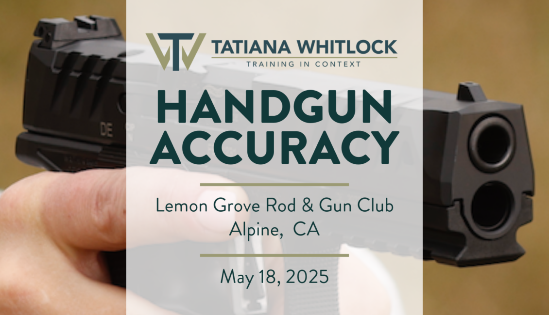 Hone your pistol accuracy skills and take your marksmanship to a higher level in this 8-hour course. This class aims to develop the core physical, visual, and mental skills that produce consistent accuracy on target. Marksmanship skill builder drills and exercises raise the group’s performance, and one-on-one instruction with Tatiana fine-tunes each student’s skills. It is a fun and challenging program for shooters of all skill levels!
